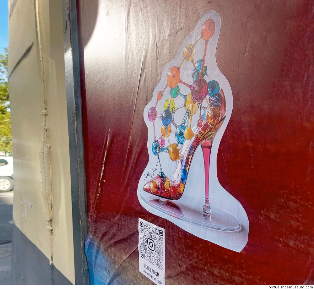 Transparant stiletto heeled pump adored with connected multi coloured spheres, paper graffiti street art, ‘Love letters to Paris’, during Paris Fashion Week, 2025.