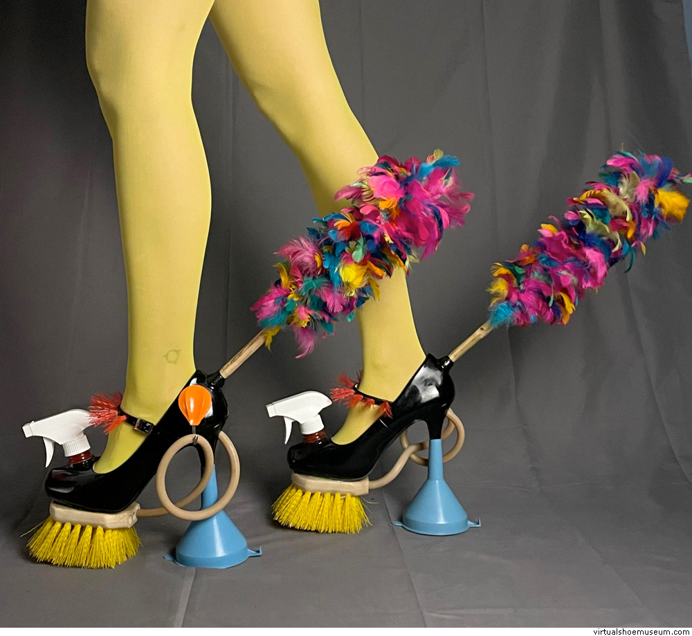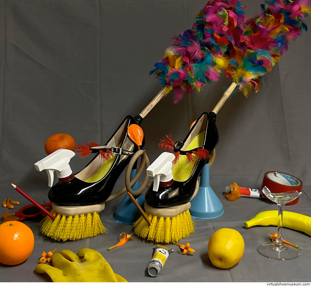 Unique pair. Mixed media: black patent leather shoes adorned with brush sole, tubes, cleaning spey, feather duster and funnel heel, 2025.