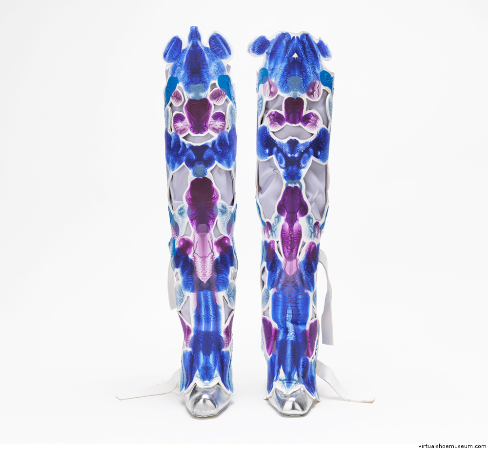 White leather boots embellished with gaiters bearing blue and purple optical illusion graphics inspired by Rorschach tests, first year SASK, dโAcademie Beeld Sint-Niklaas in Belgium, 2025.