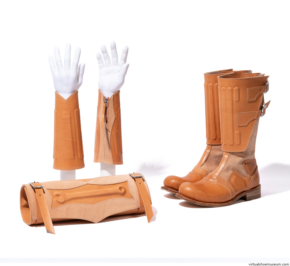 During my time in Tuscany I was briefly introduced to the process of shoemaking, inspiring me to teach myself to make shoes by hand. The result is a pair of motorcycle boots, the centrepiece of my collection. To accompany these I have produced tool roll and pair of gauntlets. I have utilised the leathers’ natural mouldable characteristics to reference the protective elements found on motorcycle boots and gloves, ordering a refined approach to traditionally utilitarian garb and balancing form with function.