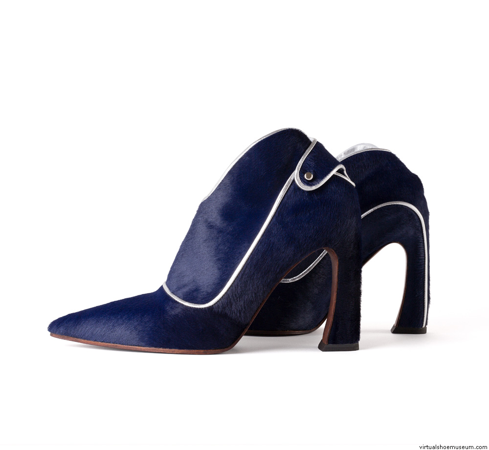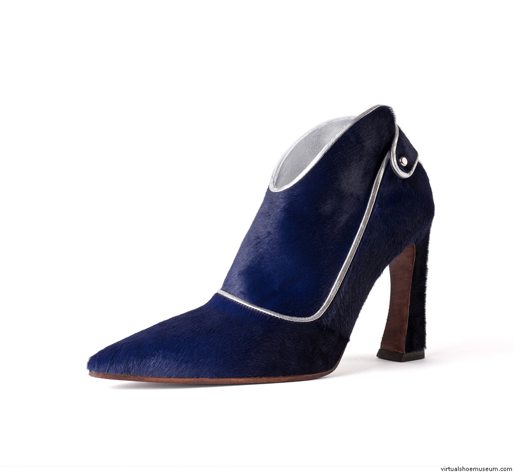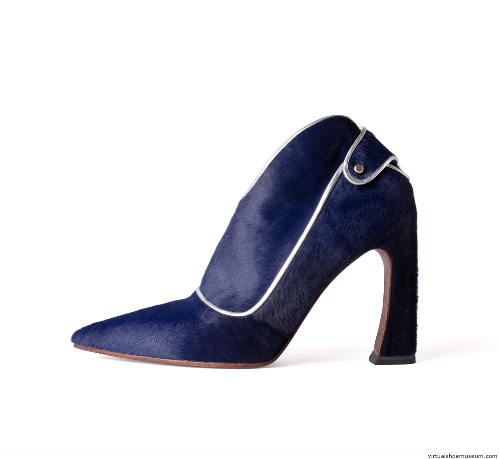 Pony-hair sculptural pump with white leather piping, quarter snap tab, 2023.