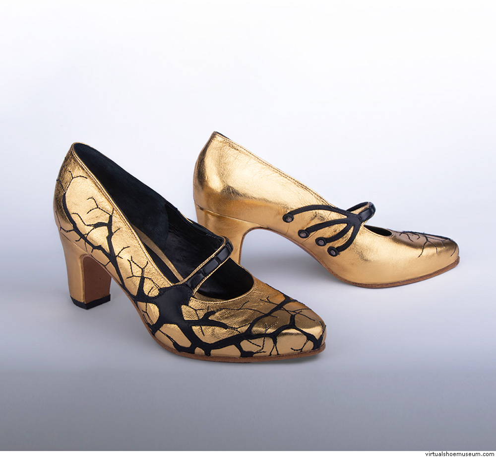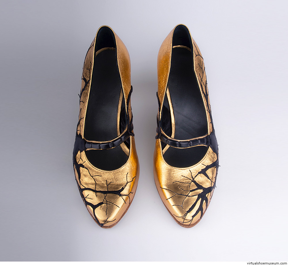 Handmade patent gold leather pumps embroided with a black single neuron, 2026.